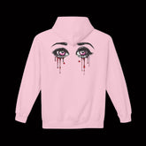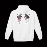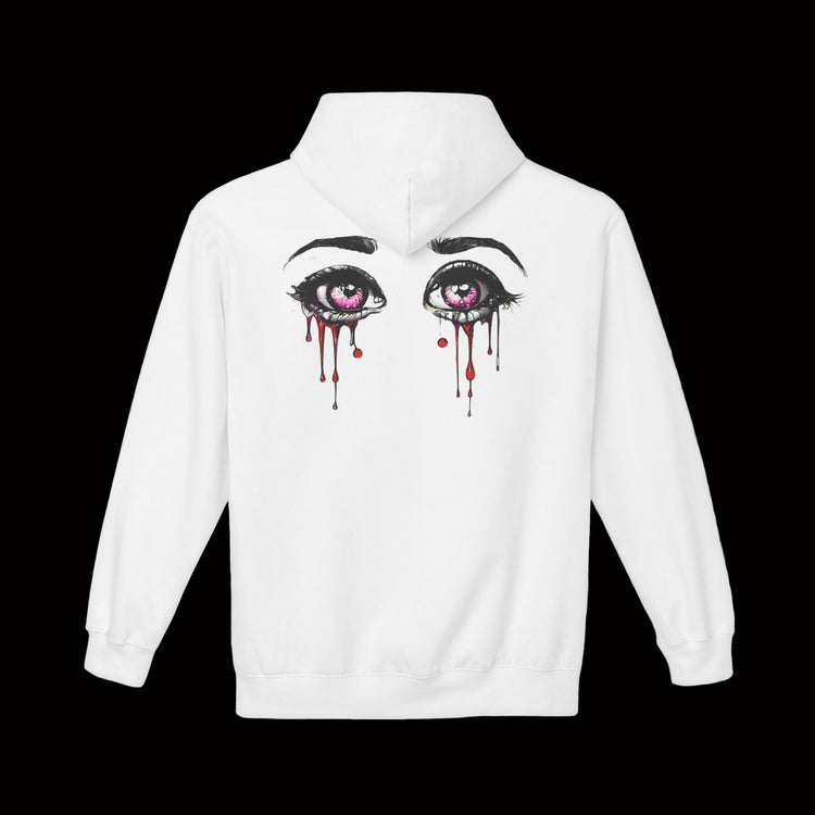 Esta hoodie de peso medio combina un ajuste relajado y espacioso con un interior cepillado que resulta suave y cómodo en la piel. En la espalda, los ojos estilo acuarela con tintas que gotean y tonos malva profundos convierten la prenda en una pieza de arte portátil, íntima y expresiva.