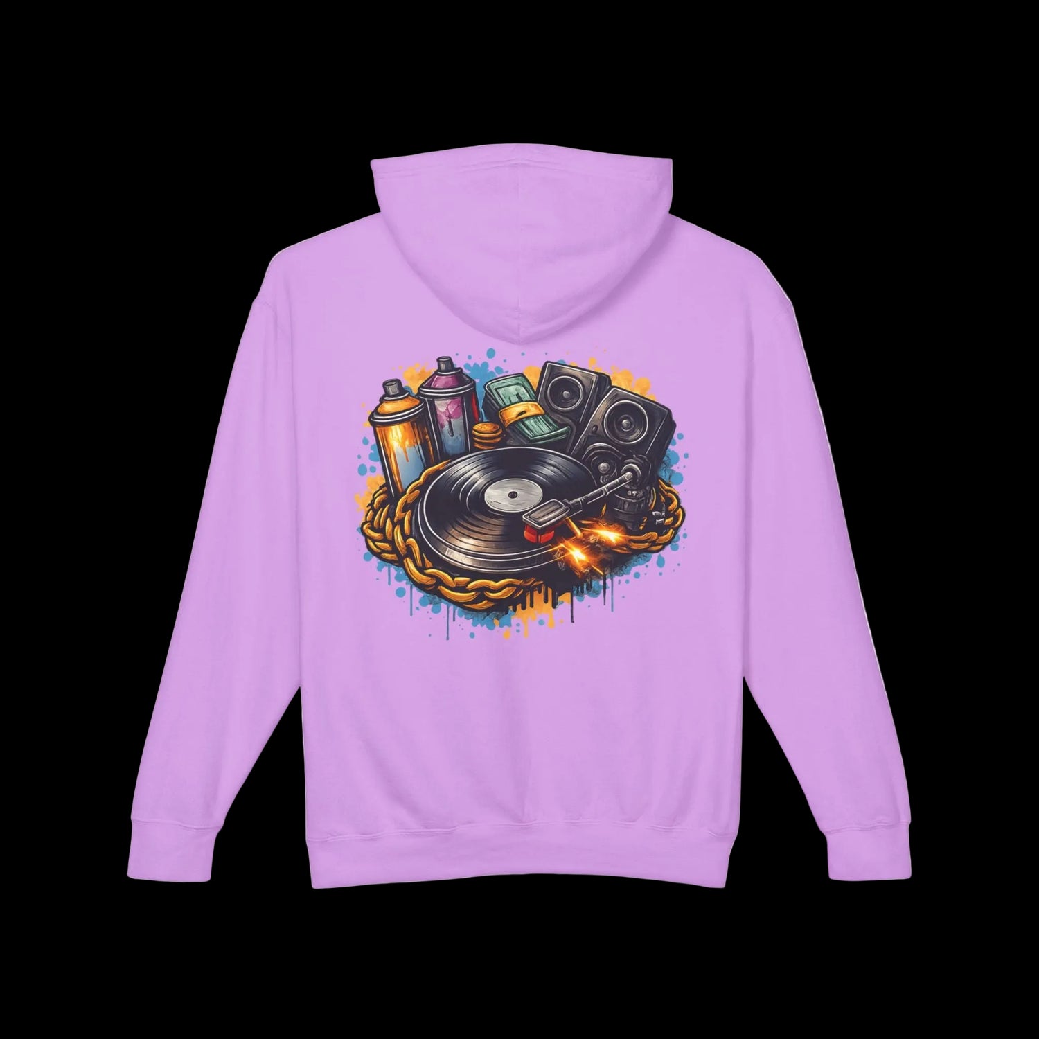 En la espalda, un gráfico potente reúne un vinilo, botes de spray, altavoces y una cámara: una imagen que captura el pulso de las sesiones callejeras, los trayectos nocturnos y las horas de estudio donde nacen las ideas. Su corte relajado y los hombros adelantados permiten moverte con facilidad y combinarla sin esfuerzo sobre camisetas o camisas de franela.